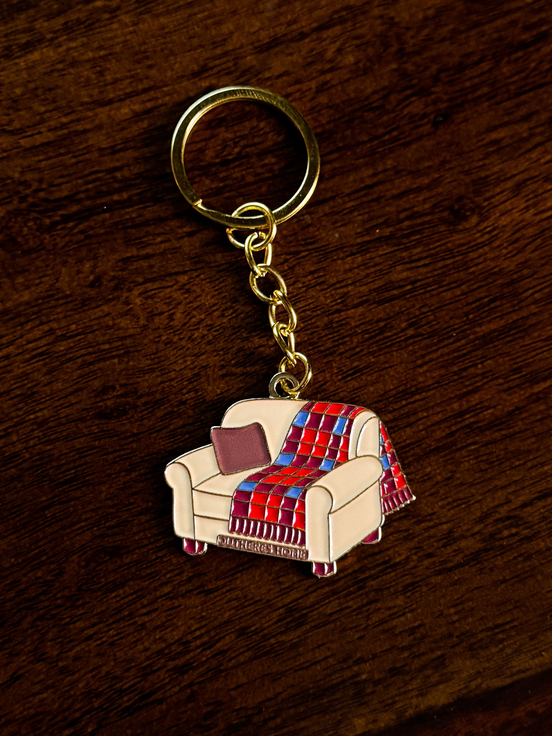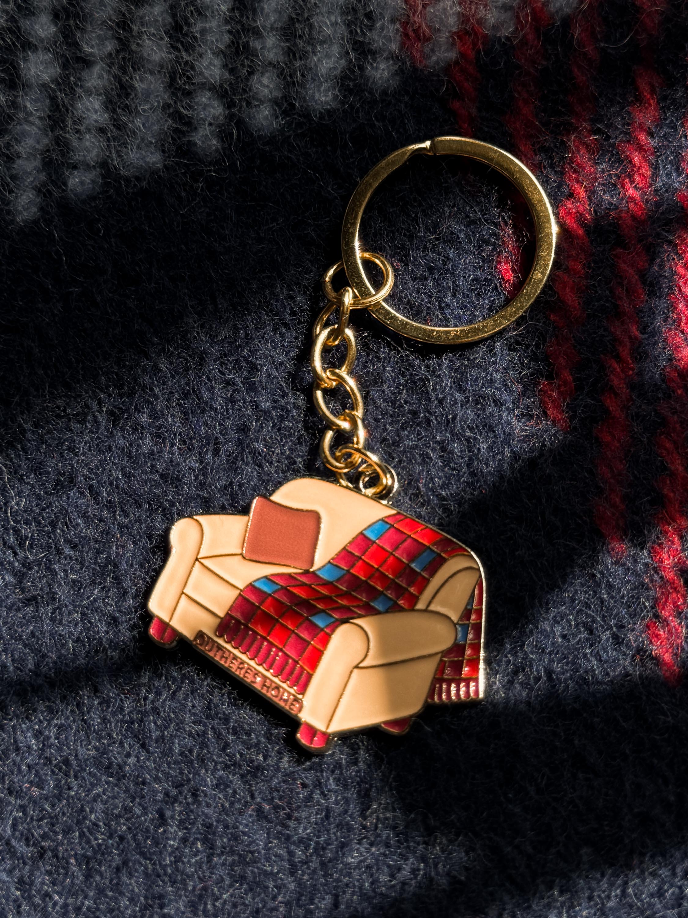 Metalowy, emaliowany brelok w kształcie fotela z motywem naszego bestsellerowego koca Mountain Classic.